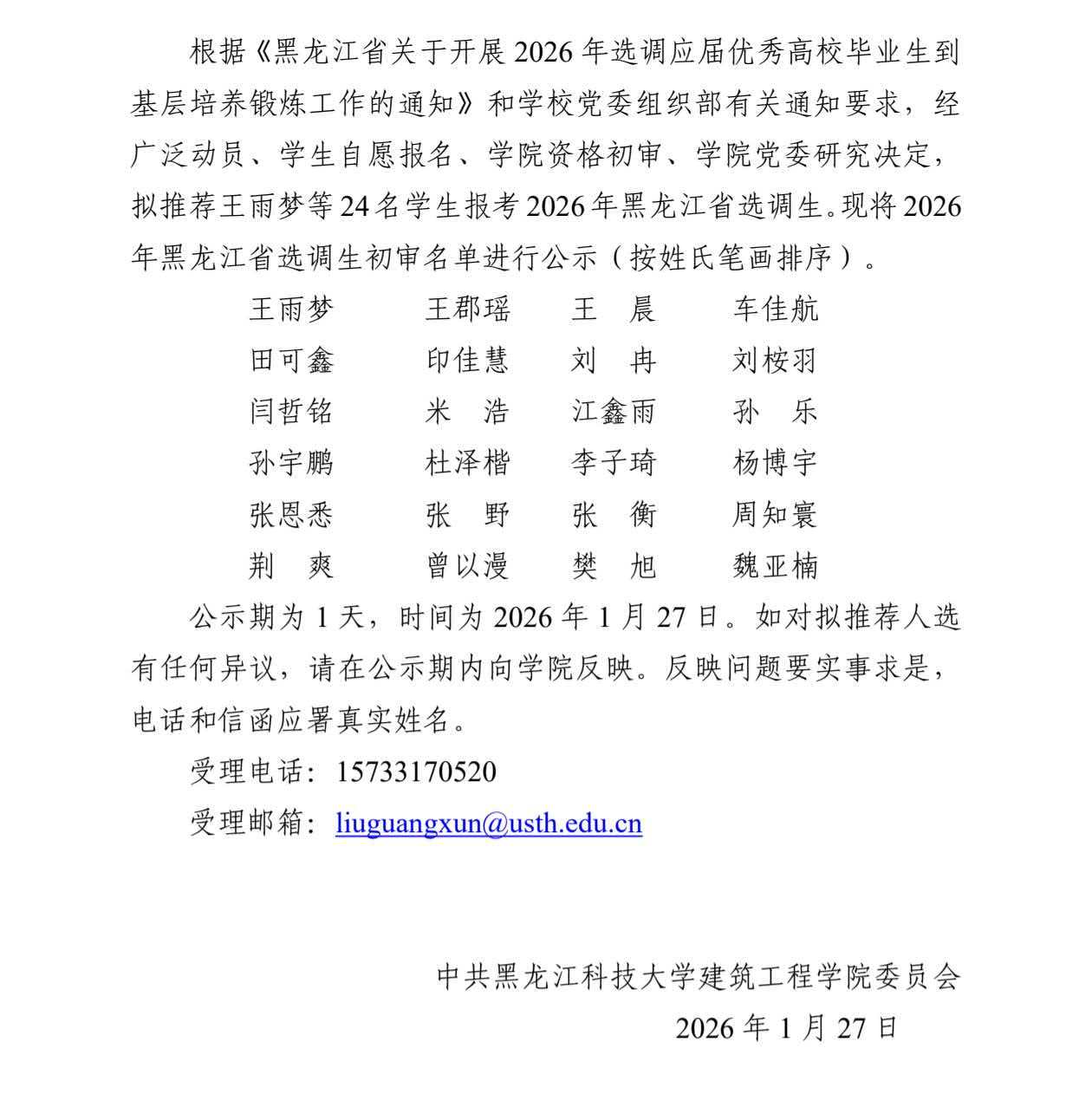 建筑工程学院2026年黑龙江省选调生初审名单公示